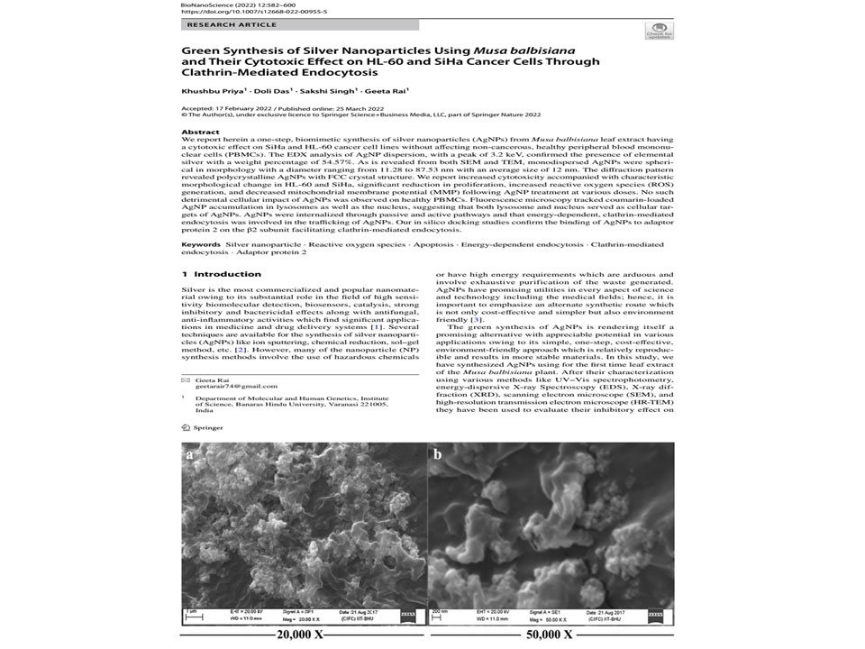 - A Novel Silver nanoparticle conjugate prepared from a phytochemical extract causing preferred apoptosis in cancer cell lines and the preparation process therein. (Ind. Patent Appln. No.201711018834 /DEL/2017) Patent No. 419319 Granted.
